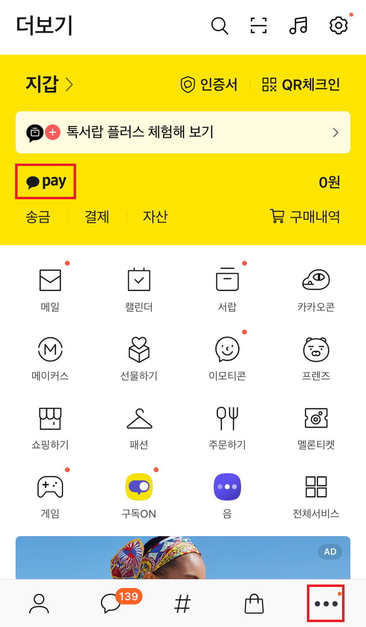 카카오톡 오른쪽 하단의 '···'를 클릭하고 위쪽의 pay라고 빨간색 박스 있는 곳을 터치합니다.