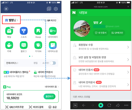 네이버 앱 > 왼쪽 위 삼선 메뉴(≡) 터치 > 별명 터치 > 네이버 인증서, 전자문서 터치