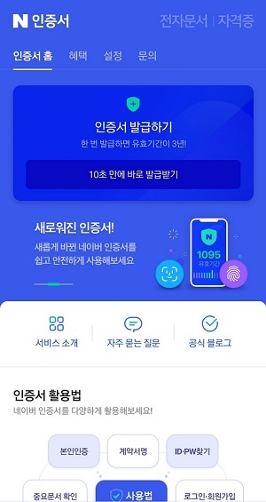 모바일의 경우 네이버 앱을 통해 인증서 발급이 가능합니다.